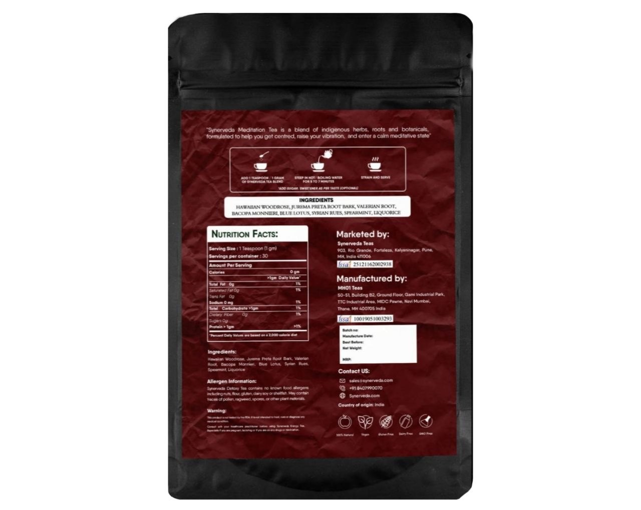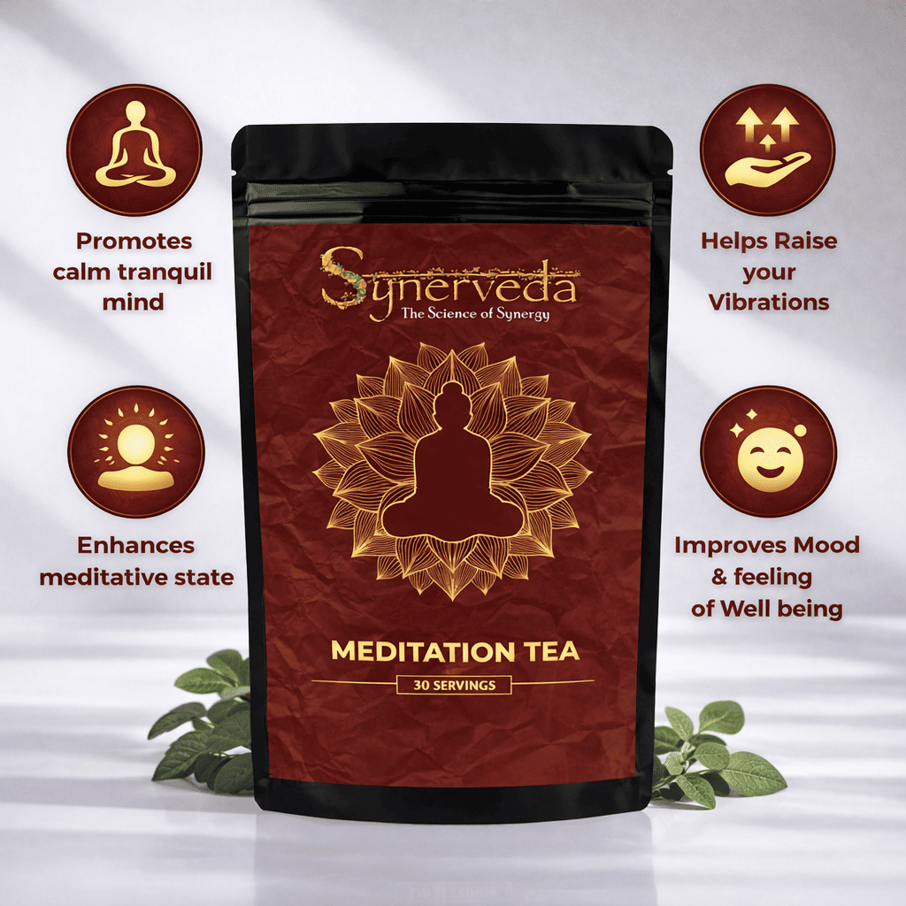 Synerveda Meditation Tea is a blend of indigenous herbs, roots and botanicals that aims to enhance your brains neurochemistry to put you in a calm, tranquil meditative state. Some of these herbs are relaxants that help stop the mind’s idle chatter, the biggest deterrent of meditative practice, especially for beginners; while others are nootropics that keep your focus sharp, hence cumulatively propelling you into a dreamy relaxing space, and yet also keeping you in a state of tranquil awareness. It works by stimulating your Pineal gland and activating the receptors in your brain that receive neurotransmitters. A unique blend of rare and exquisite herbs, this tea has an earthy taste and can also be used as a mood enhancer, as it does provide a gush of dopamine and other feel good hormones.